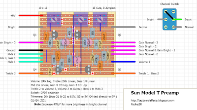 Unlike the Sunn Model T, this has not been breadboarded and tested out, I just followed the same concepts Ciaran and I used to convert the Model T preamp to use FETs. This means at this point, there may need to be some tweaking to component values to get it just right.